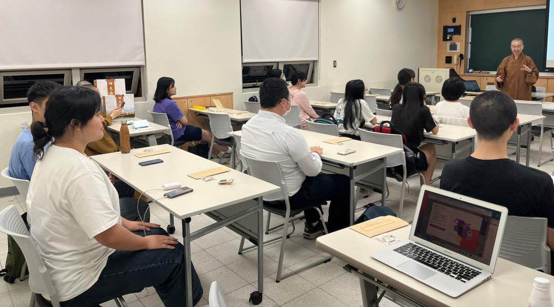 「凡走過,必留下痕跡」,八個大字於投影螢幕上十分耀眼。這樣通俗常見的諺語難道也能詮釋唯識嗎?妙南法師告訴我們,前六意識的運作,將會薰染第八阿賴耶識。講白點,就是日常的身口意造作會形成一股業力,如種子般存放在阿賴耶識。而一旦這些種子遇緣起現行,則成為我們的所作所為。